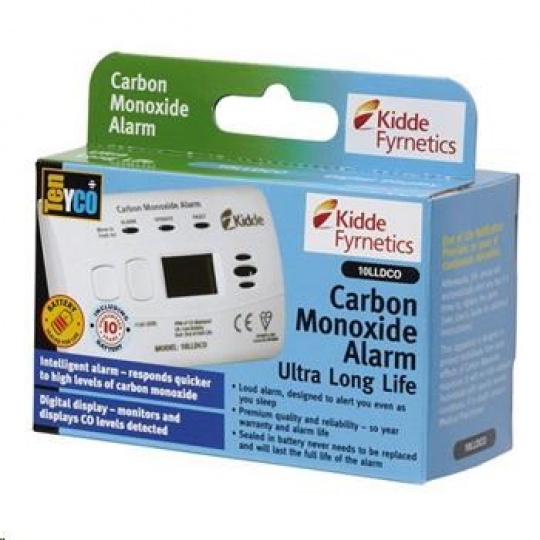 Detektor CO, měřící zařízení Kidde 10LLDCO, odolný proti vlhkosti s de-ionizovaným vodním elektrolytem, který provádí testování každou vteřinu na smrtelné nebezpečí v podobě oxidu uhelnatého. Novou funkcí tohoto nejnovějšího detektoru CO s produkce výrobce Kidde je LED indikátor, který v případě poruchy nebo nízké kapacity bateriového zdroje žlutě bliká a tak doplňuje odpovídající grafickou informaci zobrazenou na LCD panelu doprovázenou varovným akustický signálem a speciální zámek, jehož cílem je zabránění odstranění zařízení instalovaného na stěnu dětmi nebo nepovolanými osobami.