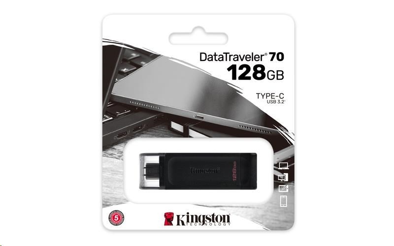 DataTraveler 70 značky Kingston je přenosný a lehký flash disk USB-C, který nabízí rychlosti rozhraní USB 3.2 1. generace. Je určen k použití s kompatibilními zařízeními USB-C, například notebooky, tablety a telefony. S kapacitami až do 128 GB dokáže disk DataTraveler70 velmi dobře rozšířit vaše úložiště pro každodenní použití. Vztahuje se na něj pětiletá záruka a bezplatná technická podpora.