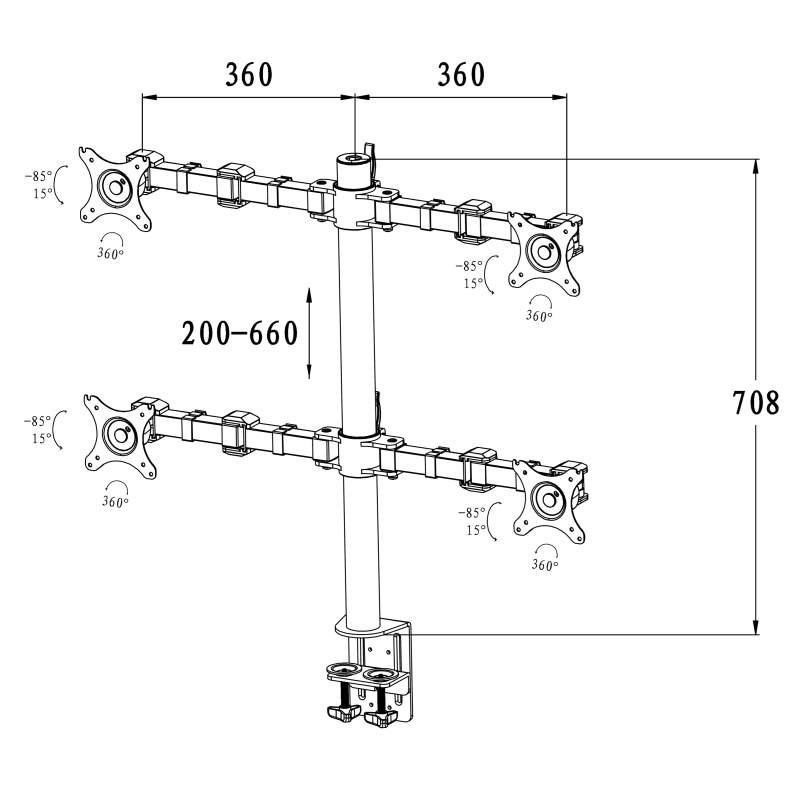 Kvalitní stolový držák na 4 monitory Ergosolid NF44 Držák na 4 monitory 10-30", nastavení polohy, kvalitní, spolehlivý a bezpečný, 2 typy uchycení na stolové desky, VESA 75x75 a 100x100, nosnost 40kg Speciální držák na 4 monitory pro vytvoření monitorové stěny. Snadné nastavení každého monitoru do požadované polohy. Ideální do kanceláří, callcenter, monitorovací a sledovací firmy, ostrahy objektů, IT specialisty atp. Nosnost 40kg, podpora VESA 75x75 a 100x100, nastavení výšky, otáčení do stran, náklon, rovina obrazovek. Barva černá. Záruka 3 roky. Stolní držák na 4 monitory pro vytvoření monitorové stěny, polohování jednotlivých monitorů, snadné nastavení, výborná kvalita - Ergosolid NF44 Technické údaje: nosnost 40kg (4x10kg) podpora VESA standardu 75x75 a 100x100 ideální na monitory s úhlopříčkou 10" až 30" nastavení výšky monitorů nezávislé polohování každého ramene sestavení monitorů do roviny nebo do V otáčení do stran náklon monitoru rotace monitoru, korekce roviny, možnost přetočení na výšku vysoká kvalita systém pro vedení kabelů spolehlivý stolní úchyt barevné provedení černé záruka 3 roky Levný ale kvalitní, spolehlivý a bezpečný držák na 4 monitory 10-30 palců - Ergosolid NF44 Držák na 4 monitory Ergosolid NF44 podporuje VESA standardy: VESA 75x75 VESA 100x100.