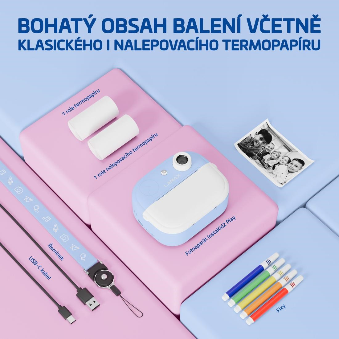 LAMAX InstaKid2 Play je foťák, který neztrácí čas. Děti si s ním jednoduše zaznamenají každý důležitý moment a během vteřiny ho mají v ruce. Černobílé snímky se mohou proměnit v barevné vzpomínky pomocí fixů, které jsou součástí balení – stačí je jen vybarvit, přidat do vlastního alba nebo jimi potěšit třeba babičku. Díky jednoduchému ovládání, dvěma ruličkám v balení (včetně samolepicí), originálnímu designu a výkonné kameře se 48 Mpx a FullHD videem, se foťák stane nepostradatelným společníkem na výlety, oslavy i tvořivá odpoledne s kamarády. Oblíbí si ho i starší děti, které si mohou své snímky i videa ukládat na microSD kartu a uchovat si tak své první filmařské pokusy. Na výběr je růžovánebo modrá varianta a nechybí ani praktická šňůrka na krk, aby měly děti foťák stále po ruce. A když zrovna nefotí? Zábavu zajistí pět her přímo ve fotoaparátu. Tento foťáček totiž není jen o vzpomínkách, je také o radosti, sebevyjádření a fantazii.