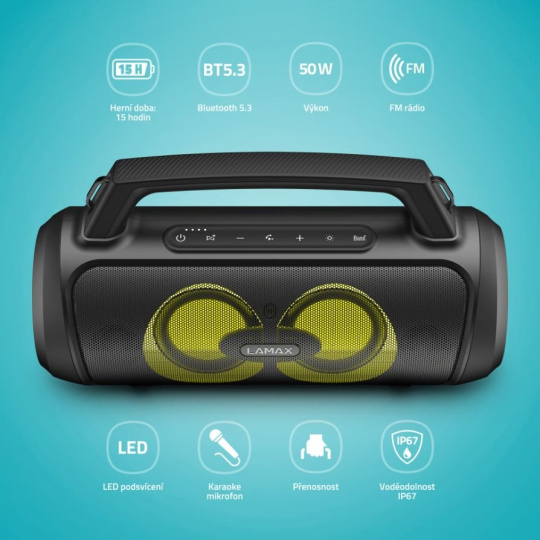 Malé tělo a velký výkon co naladí i rádioUdávej tón každé party s přenosným reproduktorem LAMAX PartyGo1 Play. Jeho nevelké tělo s šikovným madlem ukrývá značný výkon 50 W. Kdekoliv si jen vzpomeneš, naservíruje ti silný, plný a bohatý zvuk díky technologii BeatBass®. Ať už se jedná o pořádnou party nebo zahradní grilovačku, vždy jim dodají ten správný vibe i 3 režimy LED podsvícení a přibalený mikrofon, s nímž si užiješ super karaoke nebo můžeš akci moderovat. Bluetooth 5.3 zařídí okamžité spárování repráku s jakýmkoliv zařízením a jistotu bezchybného přenosu až na 18 m. Připojit ho lze ale i přes USB, microSD, případně AUX a umí se proměnit v powerbanku přes USB-A vstup. Pořádnou muziku si užiješ i na cestách, baterie repráku vydrží až 15 hodin a díky praktickému popruhu si ho pohodlně hodíš přes rameno. Pokud je jeden reprák málo, pomocí True Wireless technologie ho pohodlně spáruješ s dalším. Nemáš zrovna při ruce svůj playlist? Využij FM rádio, který snadno naladíš. Reproduktor podporuje hlasové asistenty a ovládneš s ním i telefonní hovory.