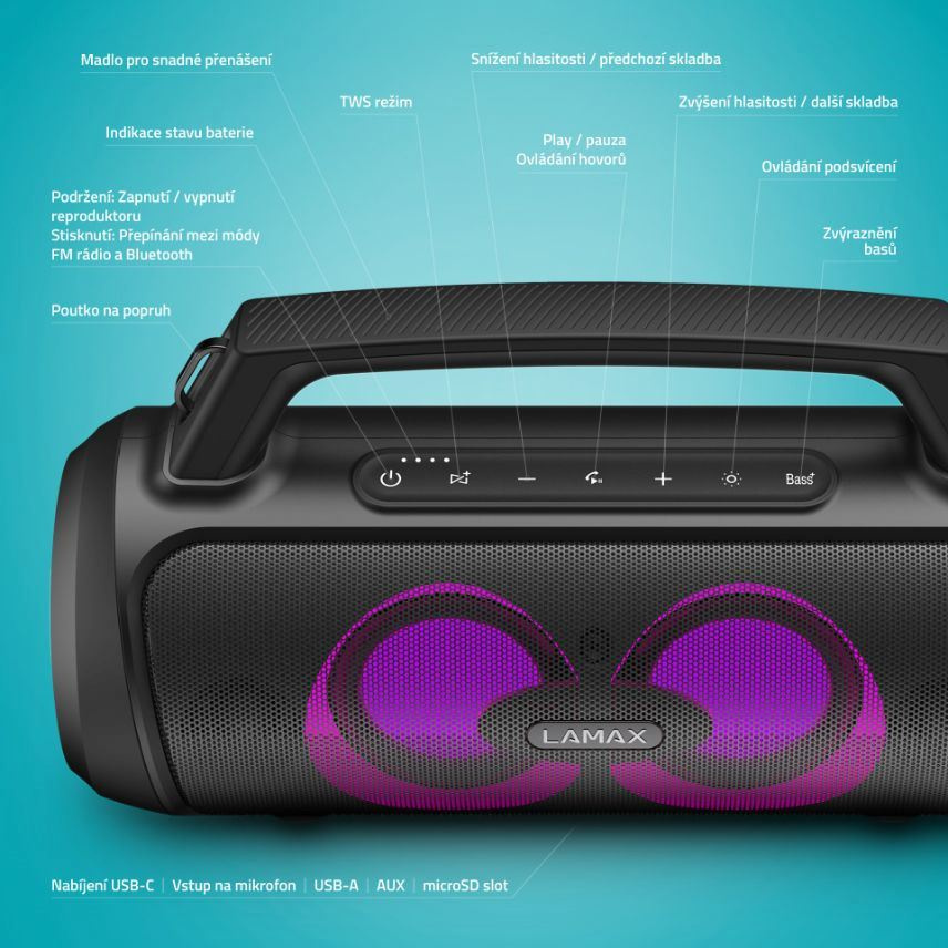 Malé tělo a velký výkon co naladí i rádioUdávej tón každé party s přenosným reproduktorem LAMAX PartyGo1 Play. Jeho nevelké tělo s šikovným madlem ukrývá značný výkon 50 W. Kdekoliv si jen vzpomeneš, naservíruje ti silný, plný a bohatý zvuk díky technologii BeatBass®. Ať už se jedná o pořádnou party nebo zahradní grilovačku, vždy jim dodají ten správný vibe i 3 režimy LED podsvícení a přibalený mikrofon, s nímž si užiješ super karaoke nebo můžeš akci moderovat. Bluetooth 5.3 zařídí okamžité spárování repráku s jakýmkoliv zařízením a jistotu bezchybného přenosu až na 18 m. Připojit ho lze ale i přes USB, microSD, případně AUX a umí se proměnit v powerbanku přes USB-A vstup. Pořádnou muziku si užiješ i na cestách, baterie repráku vydrží až 15 hodin a díky praktickému popruhu si ho pohodlně hodíš přes rameno. Pokud je jeden reprák málo, pomocí True Wireless technologie ho pohodlně spáruješ s dalším. Nemáš zrovna při ruce svůj playlist? Využij FM rádio, který snadno naladíš. Reproduktor podporuje hlasové asistenty a ovládneš s ním i telefonní hovory.