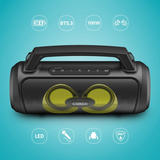 LAMAX PartyGo1 se nezdá, ale ukrývá v sobě výkon o velikosti 100 W, co rozehraje každou party na maximum. Pokud ti to nestačí, využij funkci TWS a připoj další PartyGo1 a výkon si zdvojnásob!