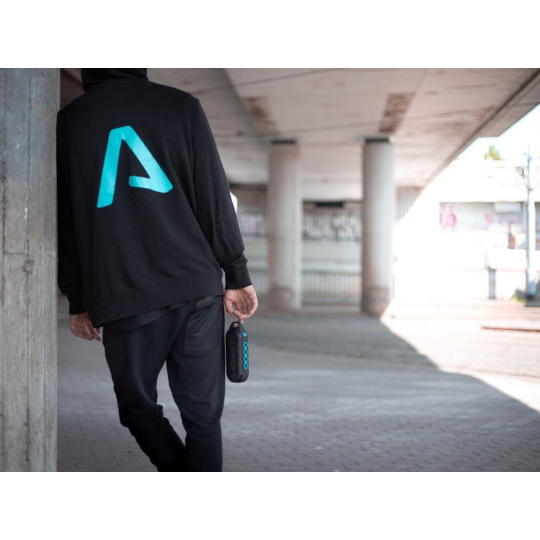 Tenhle reprák chceš mít pořád u sebe. Proto má přímo na těle praktické očko, za které se snadno nosí. V balení najdeš i užitečnou karabinu – ve vteřině ho tak můžeš přicvaknout.