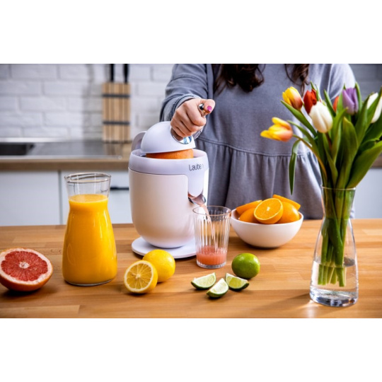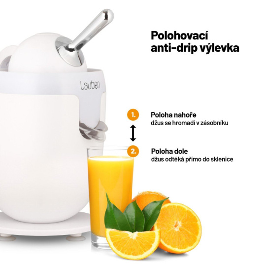 Šťáva plná vitamínů snadno a rychleVyznavačům zdravého životního stylu nesmí doma chybět pomocník v podobě elektrického citrusovače Lauben Electric Citrus Juicer 110WT. Jeho čistý design ozdobí každou kuchyňskou linku, kterou díky funkci Anti Drip nepotřísní ani kapka šťávy. Funkce proti odkapávání zajišťuje, že džus odtéká přímo do sklenice či zůstává v zásobníku. Rychlost otáček při odšťavňování je nastavena tak, aby si šťáva uchovala maximum vitamínů. Chuť navíc není nijak ovlivněna, neboť části dotýkající se ovoce jsou nerezové či z plastu splňujícího nejpřísnější nařízení EU a neuvolňují tak žádnou pachuť ani aroma. Tvar kužele a nastavení páky proces odšťavňování zefektivňují a tichý provoz umožňuje přípravu džusu v jakoukoliv hodinu. Bezpečný provoz zajišťují protiskluzové nožičky a pojistka zabraňující spuštění, není-li lis správně sestaven. Jistě potěší i snadná údržba, odnímatelné části stačí vložit do myčky.
