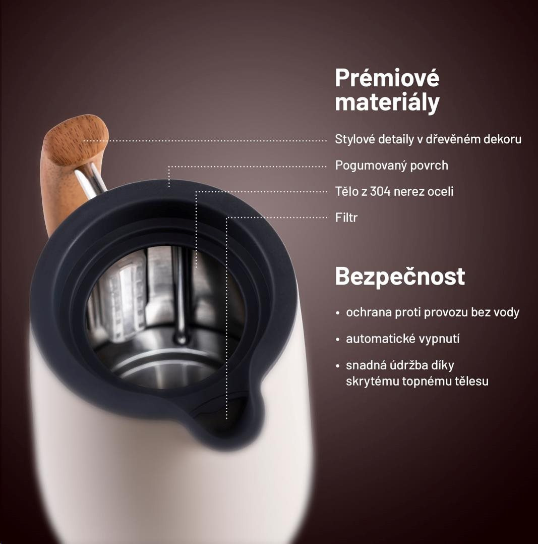 Rychlovarná konvice je jistě nepostradatelnou součástí každé kuchyně. Může být ale zároveň stylovým doplňkem, který pozvedne celý interiér na vyšší úroveň. Lauben Electric Kettle 17CR je designová rychlovarná konvice navržena v čistém severském stylu, z #304 nerezové oceli s prémiovým pogumovaným povrchem. Údržba konvice je snadná, topné těleso je skryto, tudíž se méně zanáší a konvice se lépe čistí. Mysleli jsme i na bezpečnost, konvice má pojistku proti přehřátí i vaření bez vody. Aktuální množství vody vždy poznáte z ukazatele na těle konvice. Díky svému designu konvice nejen dobře vypadá, ale je i praktická. Základna je otočná o 360° pro jednoduchou manipulaci a samozřejmostí je prostor pro skrytí kabelu, který jinak překáží a nevypadá hezky.