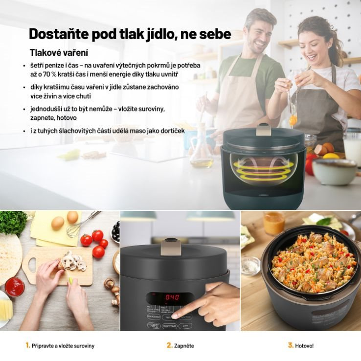 Dostaňte pod tlak jídlo, ne sebeTlakové hrnce bývaly vždy vítanými, avšak obávanými společníky v domácnosti. Energeticky úsporný víceúčelový elektrický tlakový hrnec Lauben Electric Pressure Cooker 5000AT má všechny výhody tzv. papiňáku a ještě víc, jen v moderním a bezpečném hávu. Čas i peníze šetří kratší dobou přípravy díky tlaku uvnitř, navíc takto se zachová v jídle více živin. I když nejste kuchařský mistr, oblíbíte si fakt, že do hrnce stačí dát suroviny, zapnout a on se už postará. Hrnec disponuje 9 přednastavenými programy a 3 úrovněmi požadované struktury masa. Čas přípravy ovlivníte i manuálně. 5l objem stačí pro celou rodinu, údržba je snadná, bezpečnost zajišťuje One Touch ventil pro upuštění tlaku. Jídlo udrží teplé funkce Keep Warm, lepší plánování umožní odložený start. Balení obsahuje též kuchařku.