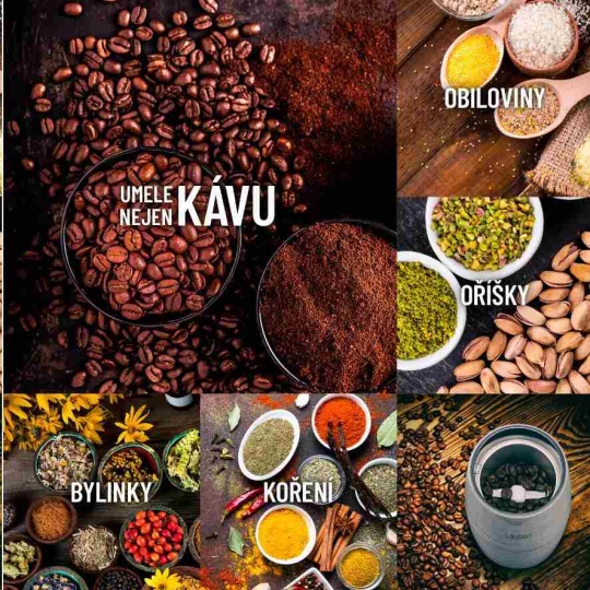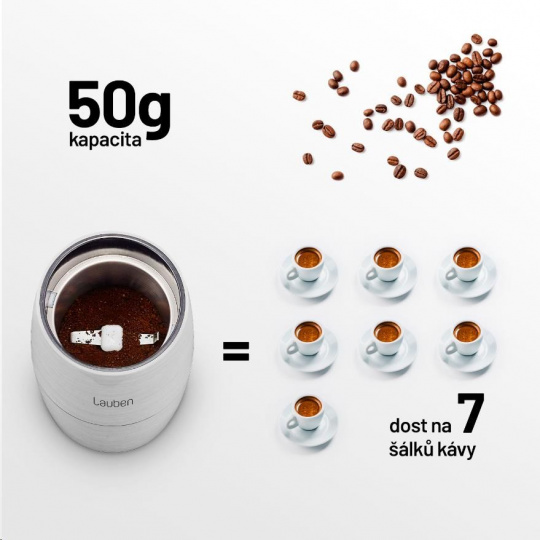 S kávovými zrny si mlýnek Lauben poradí s přehledem, zvládne ale i bylinky, semínka nebo oříšky do vánočního cukroví. O rovnoměrný a rychlý výsledek se stará celoměděný motor o příkonu 200 W. Velkou výhodou mlýnku je možnost přesné regulace hrubosti mletí díky pulsnímu spínači. Mlýnek ovládáte stlačením pulsního spínače na víku. Stupeň namletí tak určujete sami délkou celého procesu. Průběh mletí surovin můžete snadno sledovat skrz průhledné víko mlýnku.