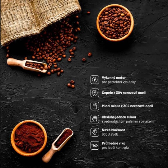 Dokonale namletá káva, ořechy nebo kořeníLauben Grinder 200ST je skvělým pomocníkem pro všechny milovníky kvalitní kávy. Mlýnek je vybavený silným celoměděným motorem, který pracuje při příkonu 200 W a má delší životnost. S tímto mlýnkem si v mžiku poradíte až s 50 g kávových zrn, ale i ořechů, semínek nebo bylinek. Sekací nůž tříštivého typu z nerezové oceli #304 se postará o rovnoměrné mletí surovin. Mlýnek se ovládá stlačením pulsního spínače na víku, hrubost namletí surovin tak můžete snadno regulovat. Pro hrubě namletou kávu nebo oříšky stačí kratší doba mletí, pro dokonale jemnou kávu nechte mlýnek pracovat delší dobu. Průběh mletí budete mít celou dobu pod kontrolou díky průhlednému víku. Tělo mlýnku i mlecí nádoba jsou vyrobeny z #304 nerezové oceli, která uchová jedinečné aroma čerstvě namleté kávy po celou dobu přípravy. Za nezaměnitelnou vůní už nemusíte ráno spěchat do oblíbené kavárny. Mlýnek se ovládá velmi snadno jednou rukou a k uvedení do provozu stačí zavření a stlačení víka. Tento způsob obsluhy je zároveň velmi bezpečný, protože mlýnek se nikdy nezapne otevřený. Samozřejmostí je pojistka proti přehřátí. Potěší vás jistě i velmi tichý chod a elegantní minimalistické provedení, které z mlýnku udělá designový doplněk každé kuchyně.