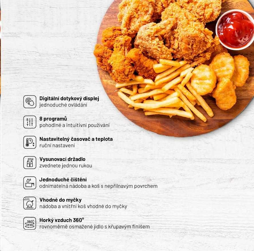 Fritéza se velmi snadno ovládá díky přehlednému dotykovému displeji a hlavní části je možné mýt v myčce nádobí. Potěší vás i vkusný minimalistický design.