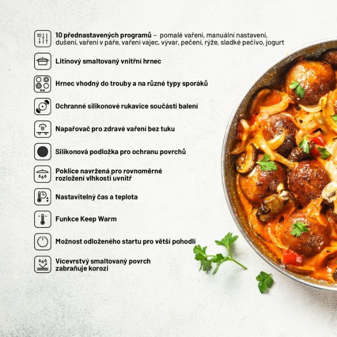 Všestranný pomocník pro moderní domácnostVíceúčelový Lauben OvenSafe® Multicooker 6000RS rozhodně nedělá ostudu svému označení. Vnitřní hrnec je poctivý litinový se smaltovaným povrchem – jako od babičky! Díky technologii OvenSafe® lze bez obav vložit do trouby či postavit na různé typy sporáků, zvládá teplotu až 250°C. Protože je 21. století v plném proudu, nádobu o objemu 6 l lze vložit i do multicookeru a rázem máte k dispozici 10 přednastavených programů pro snadné a rychlé vaření. Teplotu a čas je však možné upravit i ručně. Důležitou součástí hrnce je poklice, ta je navržená tak, aby k distribuci vlhkosti uvnitř docházelo rovnoměrně. Litina dokonale absorbuje a vede teplo a tím je vaření energeticky úspornější, smaltovaný povrch zabraňuje korozi. Jídlo připravíte snadno i v páře díky přiloženému pařáčku. Šikovnými pomocníky jsou funkce pro udržování teploty a odložený start. Manipulaci usnadňují přiložené silikonové rukavice a podložka, inspiraci přináší kuchařka.