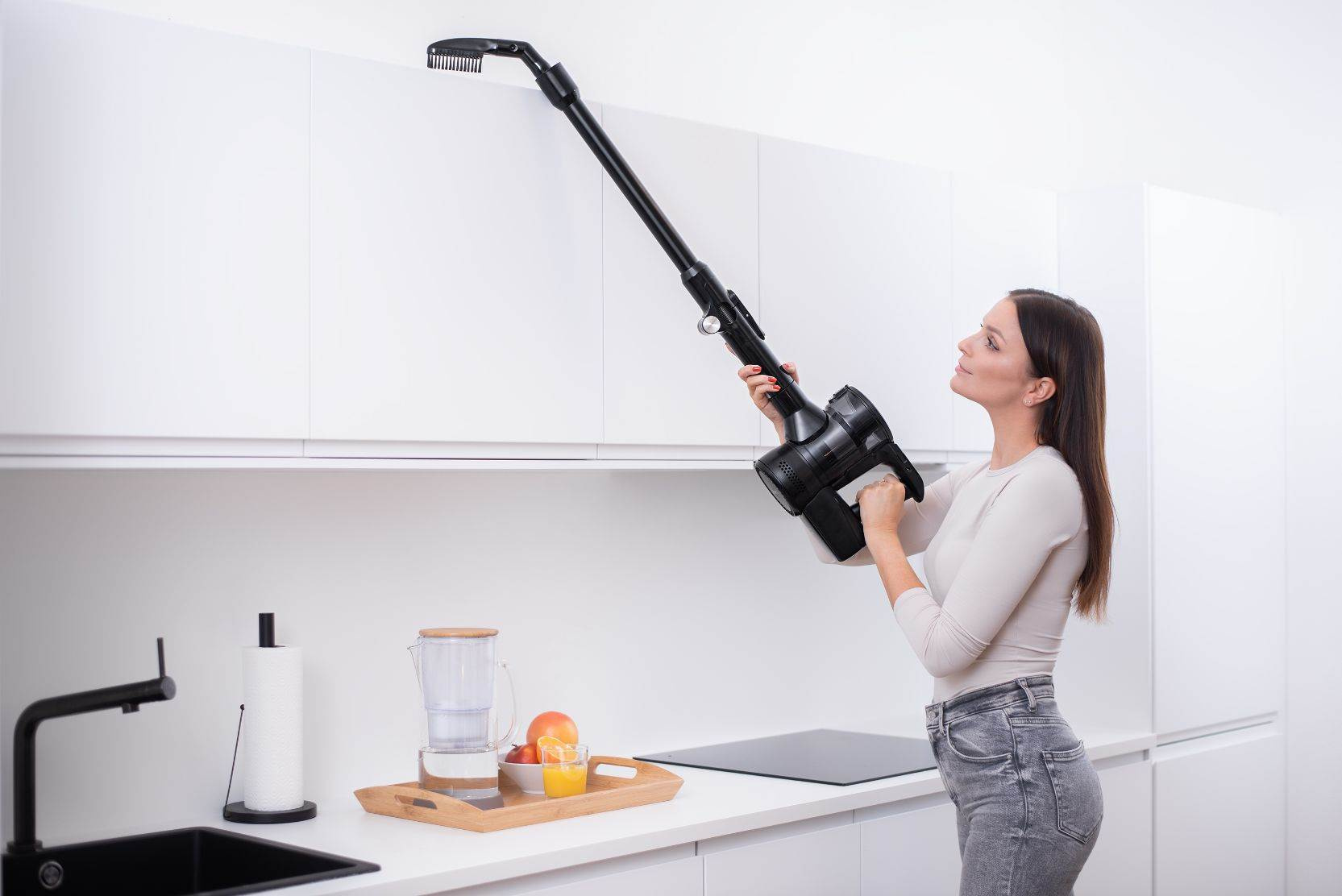 Sběrná nádoba umístěná v horní části přístroje a flexibilní tyč s kloubem dávají možnost snadného úklidu i pod nábytkem či v užších prostorech. Naopak speciálně zakřivený nástavec na prach a do výšek umožňuje pohodlný úklid na skříňkách. Do hůře dostupných míst se dostane flexibilní hadice, a zvláště majitelé domácích mazlíčků ocení hlavici s motorizovanými výměnnými kartáči, kdy antistatický je určen na tvrdé podlahy a další kartáč si poradí s koberci a zvířecími chlupy.