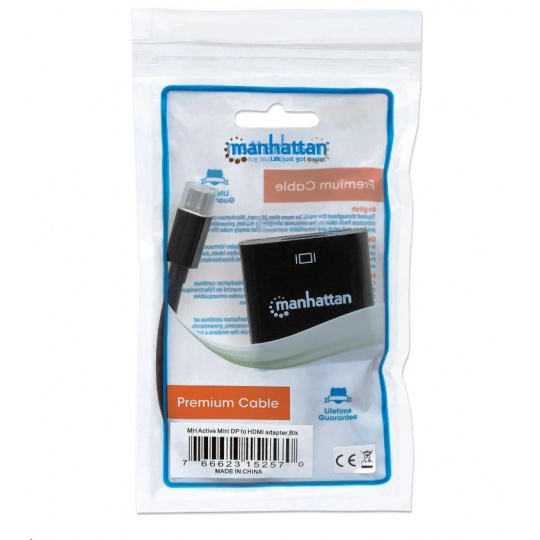 Manhattan Active Mini DisplayPort to HDMI Adapters establish a fast and convenient connection between a media source equipped with a Mini DisplayPort and an HDMI display cable. This active adapter overcomes the non-DP++ (dual-mode) video/graphics card's limitations and converts the signal to display. Ideal for multi-screen gaming, digital signage in retail displays, financial market and other applications. Nickel-plated contacts and full shielding help Manhattan Active Mini DisplayPort to HDMI Adapters provide clear and stable video transmissions in UHD, home and office multimedia applications. Durable PVC jackets and molded boots with strain relief help ensure connections remain uninterrupted and steady.