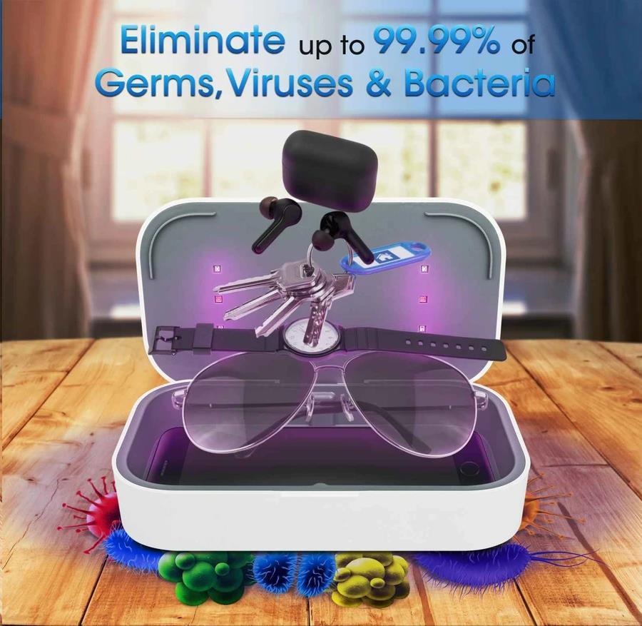 - Sanitizes smartphones, watches, keys, jewelry, credit cards, masks, pacifiers, earbuds and more