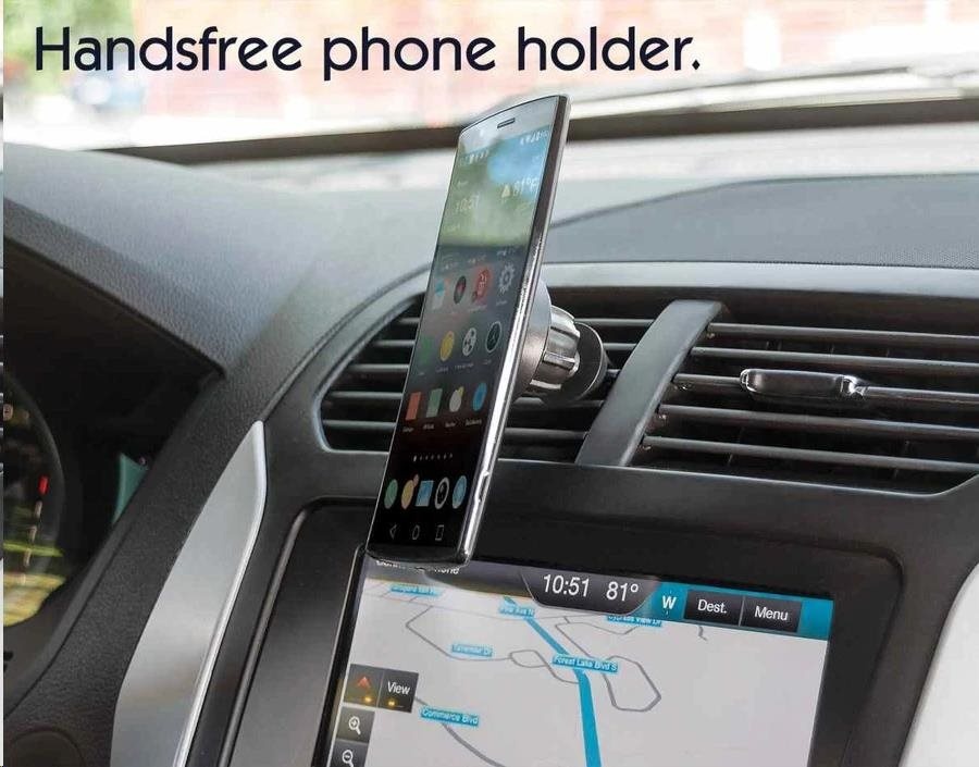 The Manhattan Magnetic Car Air-Vent Phone Mount can be used with all phones and other devices for convenient, secure device mounting while you're on the go. The Phone Mount offers two different clip sizes so you can easily install it directly into most any vehicle's air vent. Included magnetic pads allow the device to be attached in portrait and landscape positions. The adjustable, locking ball-joint offers a 360° swivel so you can angle the base in any way you see fit, and with a built-in non-skid pad, your device remains secure from road vibrations and unexpected bumps.