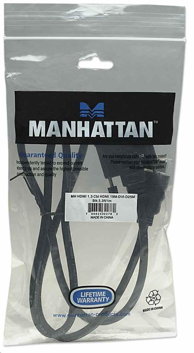 The Manhattan HDMI to DVI-D Cable delivers the brightest, most accurate colors and sharpest detail when connecting a high-definition television, LCD or plasma display, digital satellite receiver, DVD player, digital projector or other DVI- or HDMI-equipped display devices. Manhattan HDMI to DVI-D Cable is engineered and constructed of quality materials to deliver dependable transmissions in digital video applications. Full foil and braided shielding, molded boots with strain relief, protective PVC jackets and gold-plated connections help provide maximum conductivity and clear, crisp signal transmissions with reduced EMI interference and distortion.