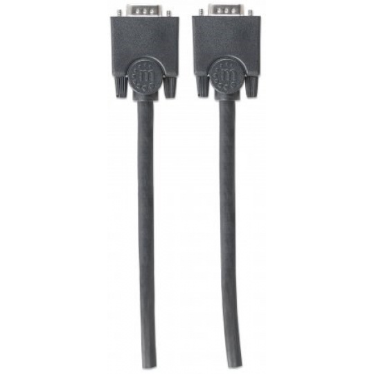 Manhattan SVGA Cables easily connect a monitor with a desktop or notebook computer. Ideal for use with video splitters, KVM switches and any HD15-equipped display, computer or device, Manhattan SVGA Cables are engineered and constructed of quality materials to deliver dependable transmissions in video applications. Full foil and braided shielding help minimize EMI interference and mini-coax (RGB) with paired video wire construction combine to provide maximum conductivity and clear, crisp images with reduced distortion over extended distances.