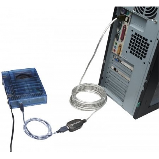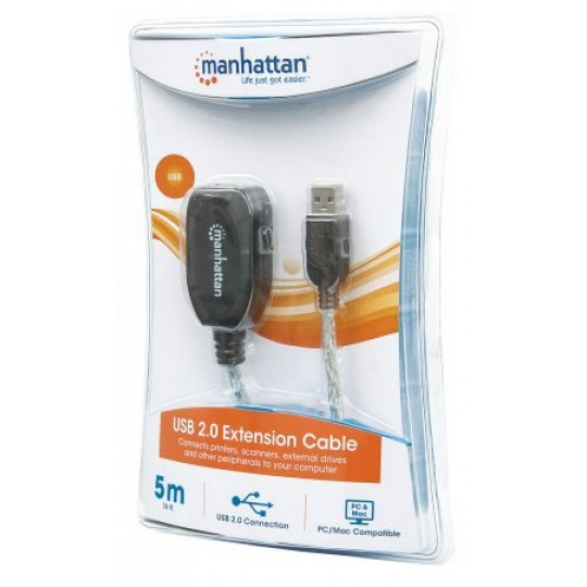 Use the MANHATTAN Hi-Speed USB Active Cable to connect a computer USB port to a USB device almost anywhere in the room. Up to three, daisy-chainable cable extensions provides a convenient, 15 m (50 ft.) connection. MANHATTAN Hi-Speed USB Active Cable with built-it repeater is fully-compliant with USB 1.1 and Hi-Speed USB specifications to help devices operate at maximum performance. Plug and Play capability, Windows7/8/Macintosh versatility and no external power or driver requirements help provide greater flexibility in computer and peripheral placement and office layout.