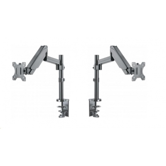 The Manhattan Universal Gas Spring Monitor Mount securely supports one 17" to 32" TV or monitor. Because it uses a gas spring to hold your display, its arm only needs the lightest touch to move your screen to the best viewing angle for you. The mount's high-quality aluminum and steel construction will provide years of reliable service. Ideal for installation on a standard-sized desk, the Manhattan Universal Gas Spring Monitor Mount lets you take advantage of the extra range of movement so you can have more space to get work done.