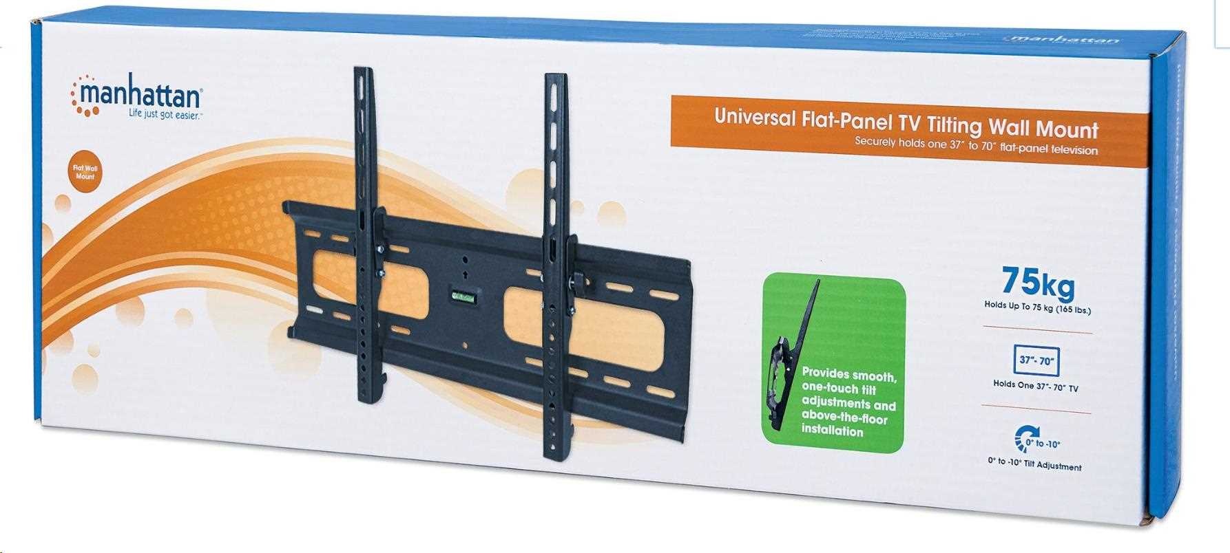 Overcome odd floor plans, annoying glare and awkward furniture placements that can diminish flat-panel TV experiences. Manhattan Universal Flat-Panel TV Tilting Wall Mounts with smooth, one-touch tilt adjustments help keep images, contrasts and colors clear, sharp and defined. VESA-compliant and constructed of quality materials, Manhattan Universal Flat-Panel TV Tilting Wall Mounts fit a variety of display sizes with a secure and confident above-the-floor installation. Ideal for residential, office, hospitality, classroom and conference room, digital signage and other commercial applications, Manhattan Universal Flat-Panel TV Tilting Wall Mounts bring high-performance LCD or plasma TV enjoyment front and center.