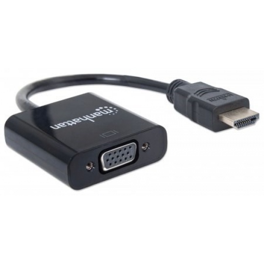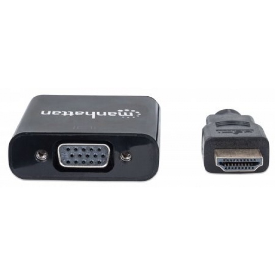 The Manhattan HDMI to VGA Converter helps establish a fast, simple and convenient link between newer HDMI-equipped desktop and notebook computers and other media sources with existing VGA monitors, projectors and other display devices. The Manhattan HDMI to VGA Converter is easy and quick to install and requires no complicated configuration or setup to help extend the service life and fully realize the investment and value of legacy VGA displays, projectors and other equipment. This low-power, cost-effective and reliable solution allows users to transition to HDMI bandwidths, resolutions, Deep Color and more without the expense of upgrading to newer and costly monitors and projectors. Its integrated, all-in-one design helps achieve a compact, integrated solution that eliminates unnecessary cables, tangles and clutter to keep installations and work spaces neat and orderly. Its Micro-USB port allows for additional power if required.