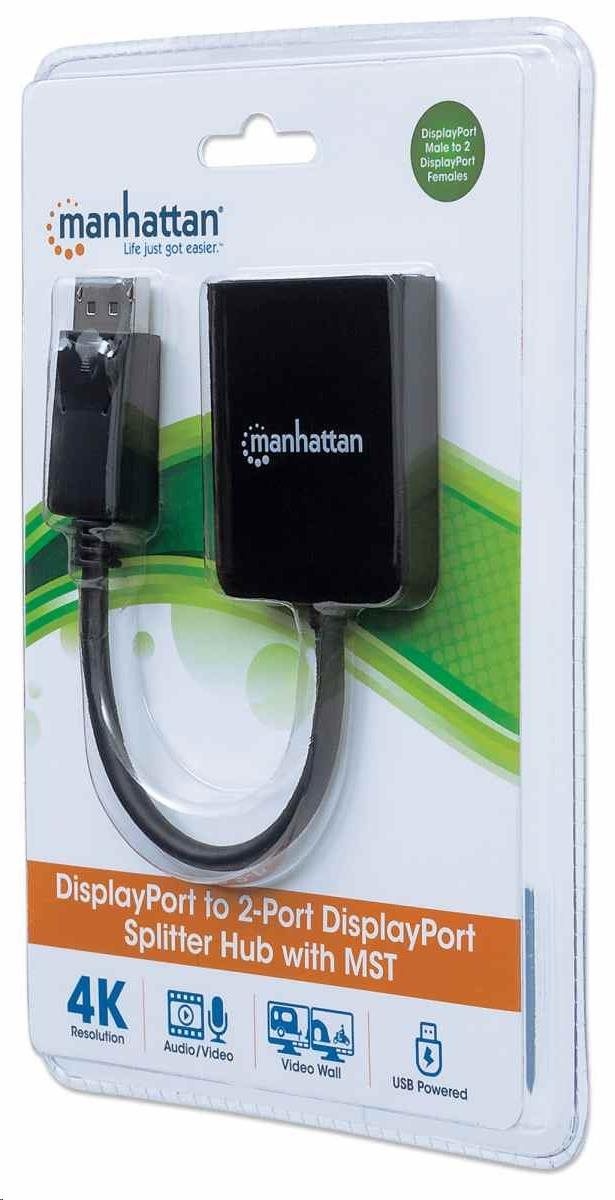 Full compliance with DisplayPort, HDCP 2.2 and DVI 1.0 ensures that the Manhattan DisplayPort to Dual DisplayPort - MST Hub can provide long service and reliable performance. Quickly connect DP cables (not included) and the included USB power cable, and this affordable, Ultra-High-Definition 4K DisplayPort solution is complete — no software/hardware configuration or complicated settings required.