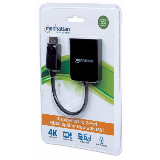 Ideal for trade shows, classrooms, video conferencing, presentations and retail applications, the Manhattan DisplayPort to Dual HDMI - MST Hub features a built-in booster for added signal strength. It’s a great choice for splitting and distributing a synchronous signal, in either mirrored or extended modes, to multiple 4K HDMI displays. MST mode creates a video wall from two displays to give the user a more immersive experience when gaming, in a conference setting or in a home office.