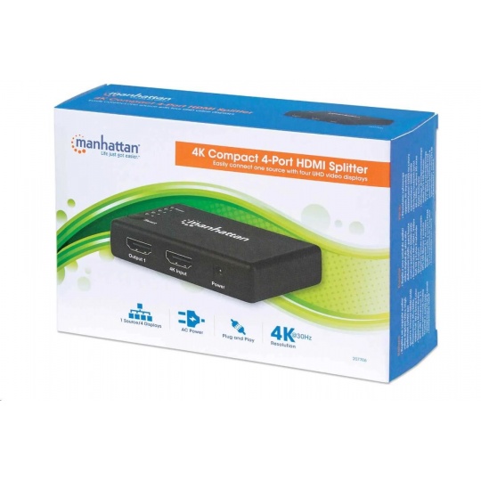 Ideal for trade shows, classrooms, video conferencing, home theater, presentations and retail applications, the Manhattan 4K HDMI Splitter features a built-in booster for added signal strength. It’s a good choice for splitting and distributing a synchronous signal to multiple 4K HDMI displays when source equipment is remotely stored in a secured room or cabinet. Cascade multiple units up to three levels to output HDMI video/audio on additional displays in widely distributed applications.