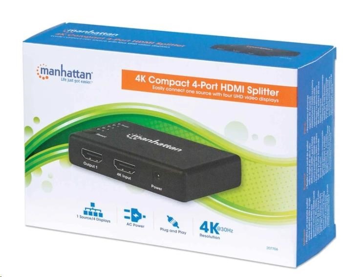The Manhattan 4K 4-Port HDMI Splitter with built-in booster streams a 4K HDMI signal from a single UHD source to up to four UHD displays.