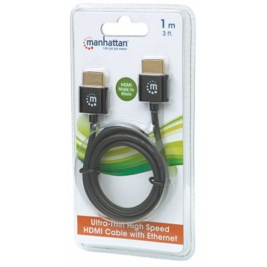 MANHATTAN Ultra-thin High Speed HDMI Cable with Ethernet, HEC, ARC, 3D, 4K, HDMI Male to Male, Shielded, Black, 1m