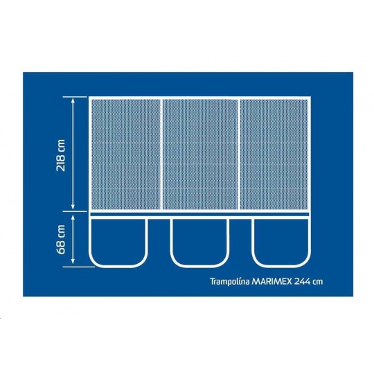 Trampolína Marimex je skvělým doplňkem každé zahrady. Děti skákání na trampolíně milují a při skákání si snadno zacvičí i dospělí - nosnost je až 100 kg. Dokonalou stabilitu zajišťují tři nohy ve tvaru písmene U. Odrazová plocha Materiál odrazové plochy patří k nejkvalitnějším na trhu. Plocha je vyrobena ze speciálního polypropylenu s ochranou proti UV záření, který zaručuje dlouhou životnost. Speciální neabrazivní (hladká) povrchová úprava zabrání odření kůže při dopadu. Vnitřní ochranná síť Vnitřní ochrannou síť najdete přímo v balení, nemusíte si ji dokupovat zvlášť. Vnitřní ochranná síť je bezpečnější než vnější síť - brání přístupu skákajícího do části s pružinami. Vstupní prostor je zajištěn třemi přezkami a brání vypadnutí. Tyče jsou obaleny ochranným návlekem z měkčené pěny. Nohy trampolíny jsou samostatné a zvyšují stabilitu celé trampolíny. Spojení tyčí nohou trampolíny a sítě je jištěno speciálními sponami. Materiál a složení ochranných prvků Trubky a stojny: pozinkovaná ocel Skákací plocha: PP (polypropylen) Ochranná síť: PE (polyethylen) Ochranný lem skákací plochy: EPE (expandable polyethylene) + vnitřní výstelka: PE (polyethylen) Bezpečnost Trampolíny jsou určené pro náročné pohybové aktivity, proto klademe důraz na jejich bezpečnost a spolehlivost. Použití kvalitních materiálů a moderních technologií při výrobě řadí naše trampolíny mezi nejbezpečnější a nejspolehlivější na českém trhu. Výhody trampolín Marimex Vnitřní ochranná síť Výjimečnost vnitřní ochranné sítě spočívá v umístění v těsné blízkosti skákací plochy. Brání vypadnutí, kontaktu s rámem a šlápnutí do oblasti pružin. Odrazová plocha Skákací plocha je vyrobena z odolných a neabrazivních materiálů s vysokou životností. Vyniká speciální úpravou, která zabraňuje odření pokožky při pádu. Certifikace bezpečnosti Všechny naše trampolíny splňují přísné bezpečností normy a jsou certifikovány zkušebnou Intertek. Bezpečnost trampolín je pro nás prioritou..