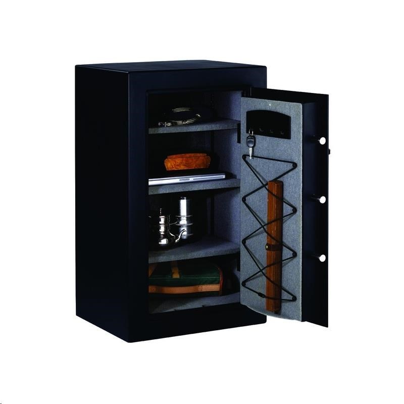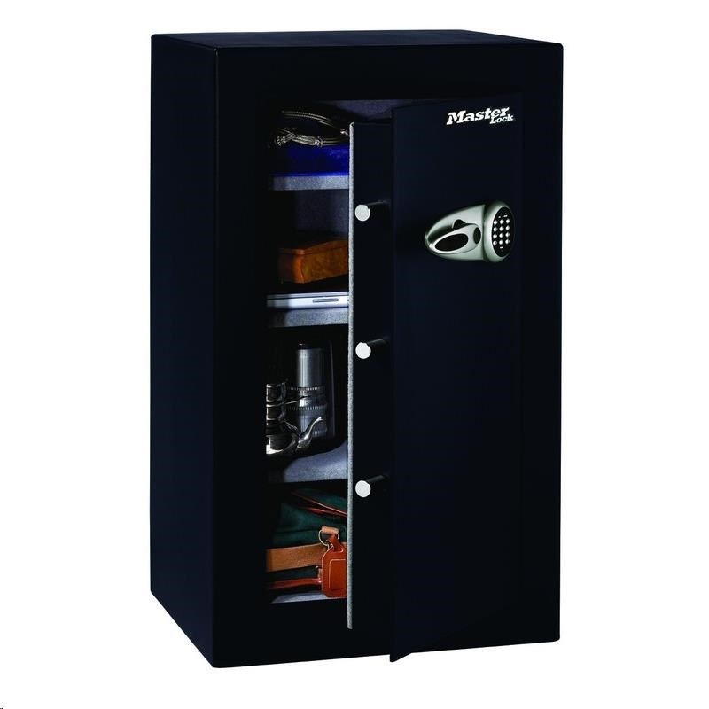 Velký digitální vysoce bezpečnostní trezor Velikost formát XXL Pevná ocelová konstrukce 3 ocelové šrouby se zámkem a skrytý závěs pro větší ochranu proti útokům Programovatelná digitální kombinace s potlačovacím klíčem Obsahuje 2 klíče 2 nastavitelné police, trezor vypolstrován kobercem Věšák na klíče, organizační systém Bungee Součástí dodávky je i šroubovací šroub Kód produktu: T0-331ML Materiál: Ocel Barva: Černá Rozměr VxŠxH (cm): vnější: 95 x 55,1 x 50,2 cm vnitřní: 90,9 x 52 x 35,9 cm Objem / celková hmotnost: 169,7 l / 99,8 kg.
