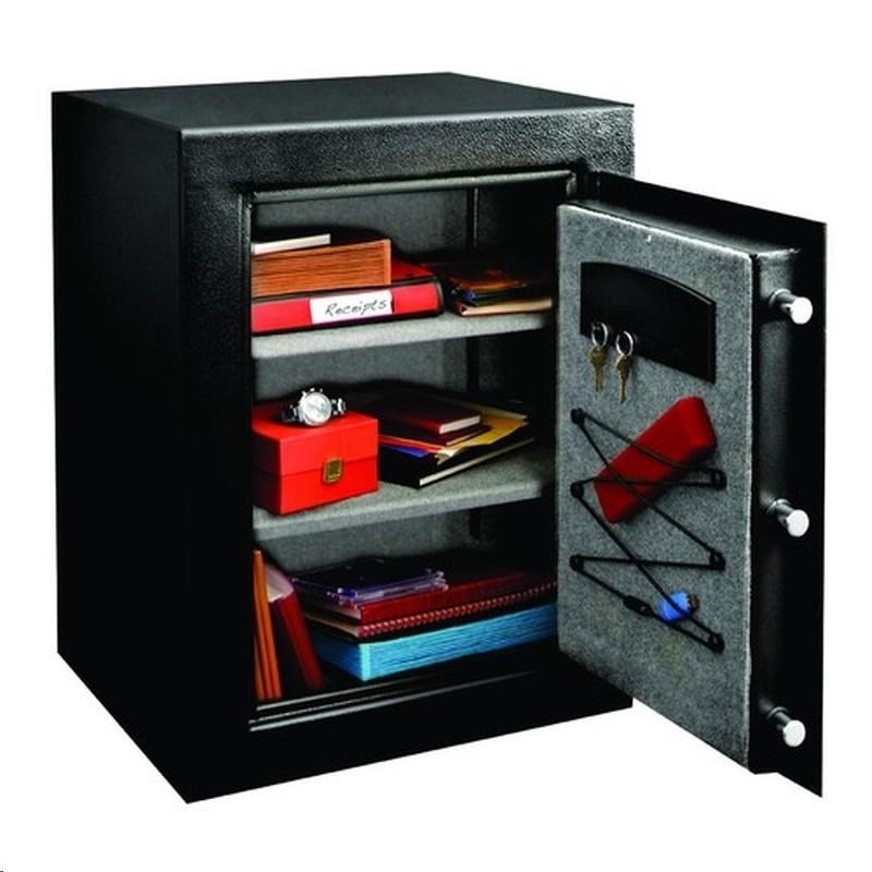 Velký digitální vysoce bezpečnostní trezor Velikost formát XL Pevná ocelová konstrukce 3 ocelové šrouby se zámkem a skrytý závěs pro větší ochranu proti útokům Programovatelná digitální kombinace s potlačovacím klíčem Obsahuje 2 klíče 2 nastavitelné police, trezor vypolstrován kobercem Věšák na klíče, organizační systém Bungee Součástí dodávky je i šroubovací šroub Kód produktu: T8-331ML Materiál: Ocel Barva: Černá Rozměr VxŠxH (cm): vnější: 70 x 55 x 50,2 cm vnitřní: 65,5 x 52 x 35,2 cm Objem / celková hmotnost: 119,9 l / 88,5 kg.