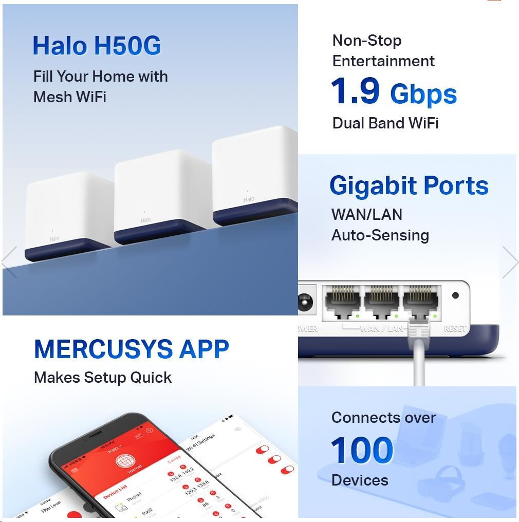 | Package Contents | 3× Halo H50G Units 1× RJ45 Ethernet Cable 3× Power Adapters 1× Quick Installation Guide |