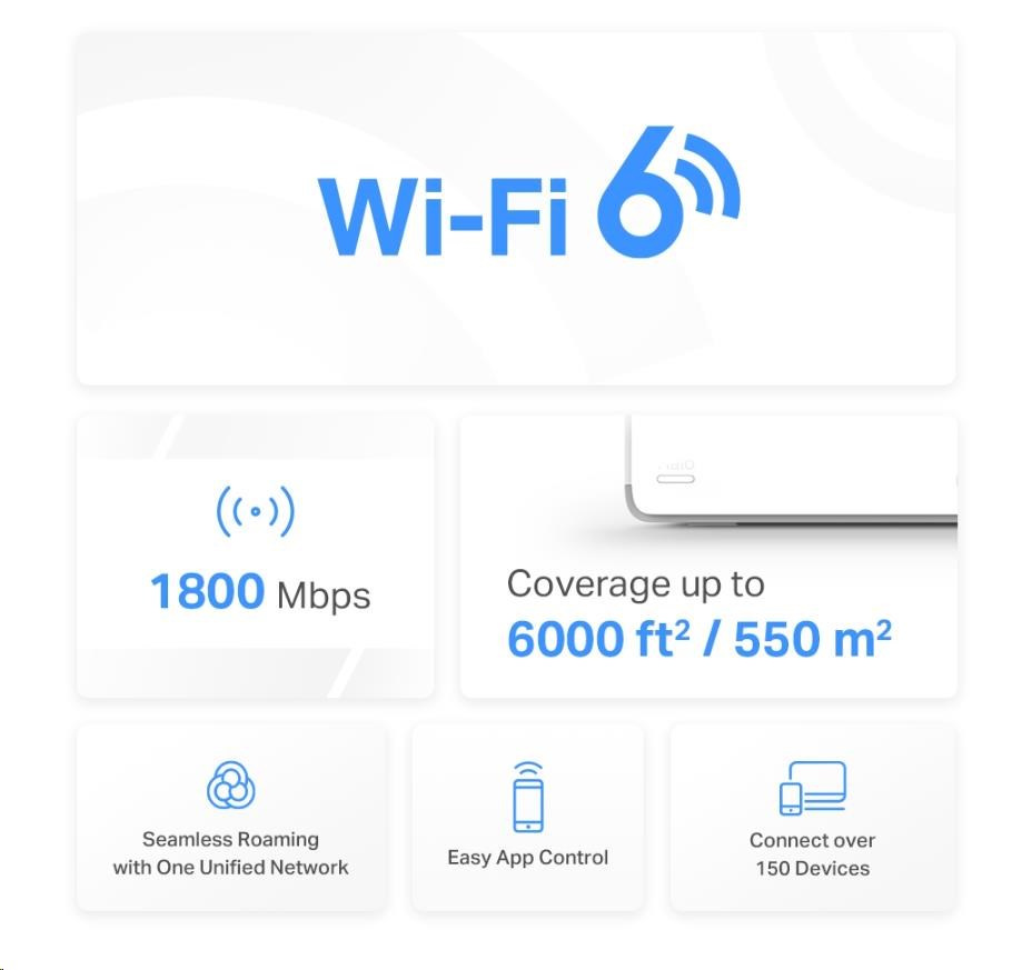 - Pokrytí celé domácnosti – pokrytí prostoru až 550 m2 (6 000 čtverečních stop) vysokorychlostní sítí Wi-Fi, která eliminuje mrtvé zóny Wi-Fi pokrytí ve vaší domácnosti.