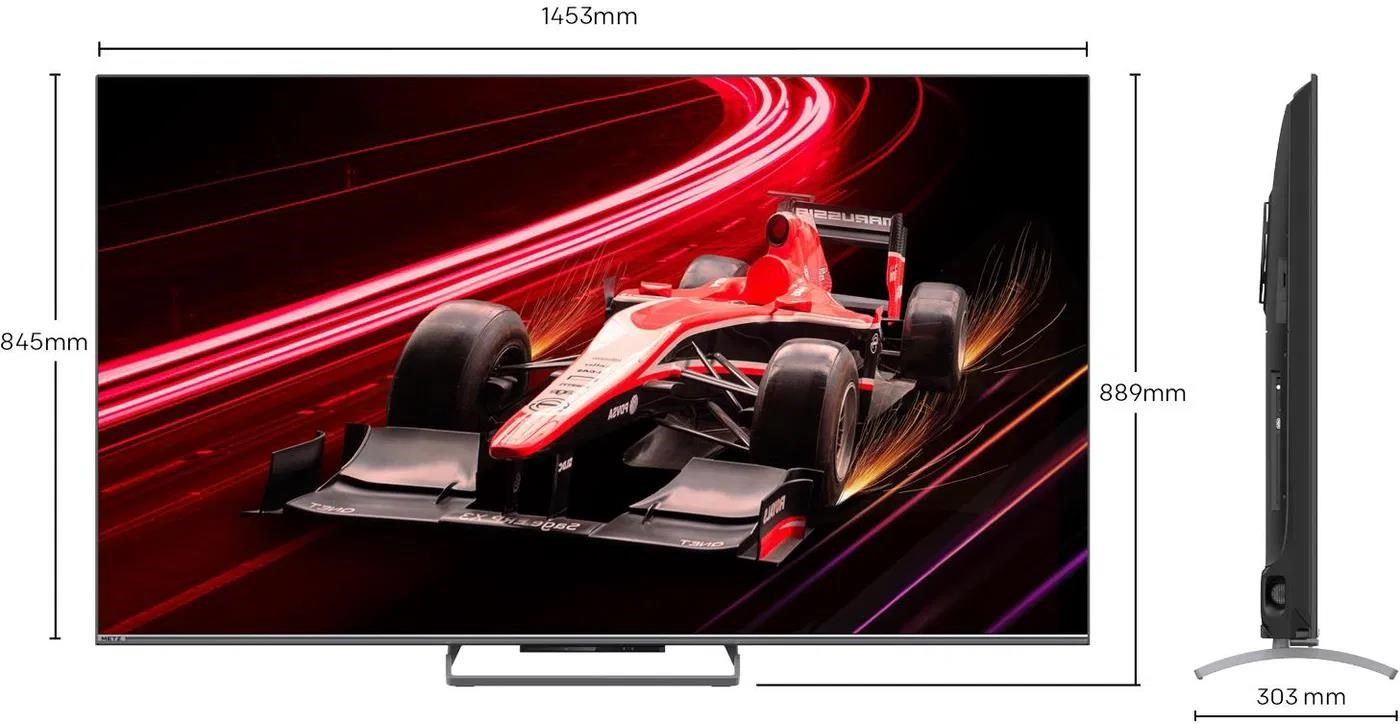 Google TV, QLED, 165cm, 4K Ultra HD, 100/120 Hz (144 Hz – herní režim), HDR10+, Dolby Vision, DVB-T2/S2/C, 3× HDMI, 2× USB, CI+, LAN, Bluetooth, Chromecast, herní režim, hlasové ovládaní, Google Assistant, párování s mobilním zařízením, Oneplay, VESA 400×200, Dolby Atmos, energetická třída F. Evropská distribuce..