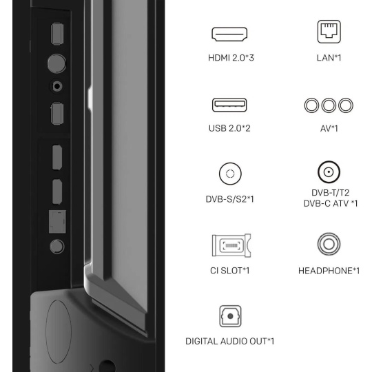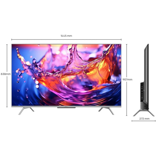 Google TV, LED, 165cm, 4K Ultra HD, 50/60 Hz, HDR10, DVB-T2/S2/C, 3× HDMI, 2× USB, CI+, USB nahrávání, LAN, Bluetooth, Chromecast, Miracast, herní režim, hlasové ovládaní, Google Assistant, párování s mobilním zařízením, Oneplay, VESA 400×200, DTS Studio Sound, energetická třída F. Evropská distribuce..