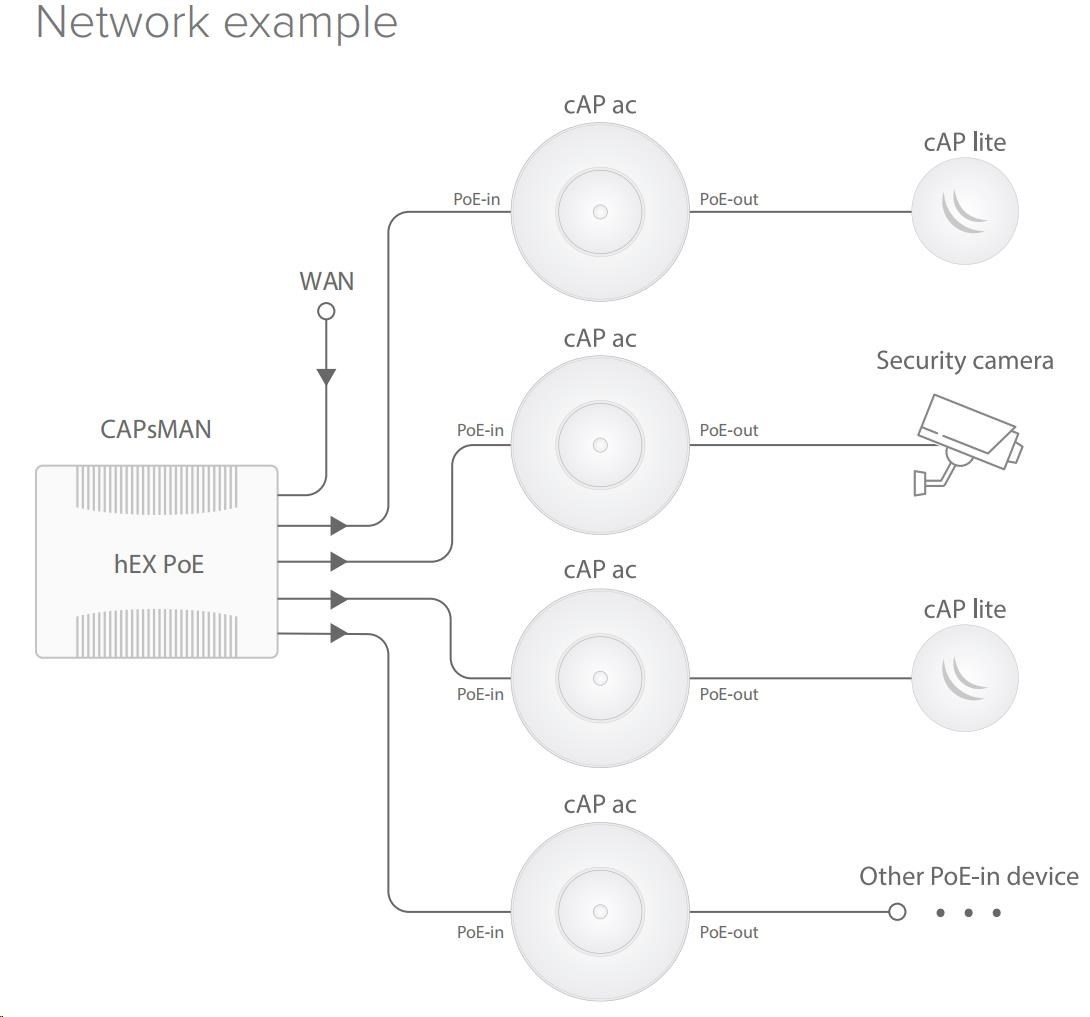 cAP ac je dual-bandové AP (2.4+5GHz) s podporou napájení PoE dle standardu 802.3af/at. Disponuje dvěma gigabit.ethernet porty z nichž první slouží jako vstup napájení (podporuje aktivní PoE 802.3af/at) a druhý jako výstup pro další jednotku (podporuje pouze pasivní PoE až do 57V). Tedy přestože jednotka podporuje režim repeater je možné další AP připojit i ethenet.kabelem do portu 2 kde bude napájeno pasivním PoE, případně může být připojena IP kamera či jiné IP zařízení podporující napájení pasivním PoE.
