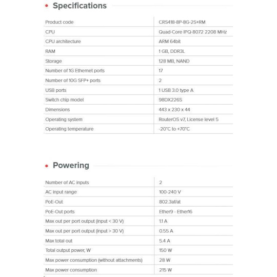 PoE CRS switch s 16x Gbps LAN (8 z nich s POE-out) , 2x 10Gbps SFP+, 1x USB 3.0 a dvěma RJ45 porty (management a konzole) v rack provedení. CRS418-8P-8G-2S+RM je dostatečně výkonný na to, aby nahradil většinu routerů pro malé a střední kanceláře. Vhodný především pro hybridní sítě na 2/3 vrstvě - ať už segmentujete síť pomocí VLAN, nebo mezi nimi routujete. Díky čtyřjádrovému procesoru ARM s frekvencí 2,2 GHz, HW offloading L3 a systému RouterOS v7 jej můžete používat jako internetovou bránu, firewall, a dokonce i jako řadič CAPsMAN. Využít můžete 8 PoE-out portů (802.3af/at a 24V pasivní PoE-out) pro napájení zařízení přímo ze switche s až 150 W celkového výkonu, inteligentním řízením PoE a omezením proudu na port. Praktické řešení pro instalace vyžadující nepřetržitý provoz s enormními objemy dat Technické specifikace: Product code: CRS418-8P-8G-2S+RM CPU: Quad-Core IPQ-8072 2208 MHz Size of RAM: 1 GB, DDR3L Storage: 128 MB, NAND Number of 1 GbE Ethernet ports: 17 10G SFP+ ports: 2 USB ports: 1 USB 3.0 type A Operating system: RouterOS v7 (License level 5) Supported input voltage: 2x AC power supply 100 - 240 V Dimensions: 443 x 230 x 44 mm Operating temperature: -20°C to +70°C Napájecí specifikace: PoE-out: 802.3af/at PoE-out ports: Ether9 - Ether16 Max out per port output (input < 30 V) : 1.1 A Max out per port output (input > 30 V): 0.55 A Max total out : 5.4 A Total output power, W: 150 W Max power consumption: 215 W Max power consumption without attachments: 28 W Upozornění: Výrobce MIKROTIK nevztahuje záruku na zařízení poškozená přepětím. Zařízení je třeba na vstupech adekvátně chránit proti indukovanému elektrostatickému přepětí či přepěťovým špičkám na silovém vedení. Při venkovních instalacích je třeba používat stíněnou kabeláž (FTP/SFTP), příslušné přepěťové ochrany (pokud nejsou integrovány) a provést korektní a efektivní uzemnění. Zařízení vždy provozujte s poslední výrobcem publikovanou verzí (výrobcem označenou "Stable") operačního systému RouterOS. Taková verze garantuje nejoptimálnější funčknost, obsahuje opravené chyby z verzí předchozích a výkonová vylepšení. .