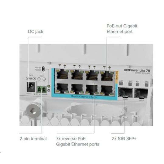 MikroTik netPower Lite 7R je reverzní PoE switch s 8x Gigabit ethernet porty, dvěma SFP sloty, napájecím DC konektorem, DC svorkovnicí a dvěma operačním systémem SwOS. Prvních 7 LAN portů umožňuje napájení přes PoE IN a 8.port podporuje PoE out pro napájení dalšího zařízení, např. přívodní antény, kamery či dalšího switche. Výhodou reverzního PoE je nezávislost na jednom konkrétním napájecím zdroji. Zařízení můžete současně napájet až 7 napájecími adaptéry přes PoE IN nebo DC jack/svorkovnici, nicméně napájení bude vždy aktivní pouze od jednoho. V případě selhání bude automaticky přehozeno na další možný.