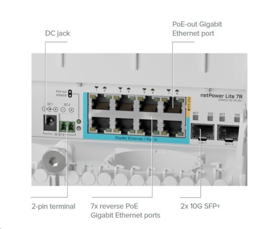 MikroTik netPower Lite 7R je reverzní PoE switch s 8x Gigabit ethernet porty, dvěma SFP sloty, napájecím DC konektorem, DC svorkovnicí a dvěma operačním systémem SwOS. Prvních 7 LAN portů umožňuje napájení přes PoE IN a 8.port podporuje PoE out pro napájení dalšího zařízení, např. přívodní antény, kamery či dalšího switche. Výhodou reverzního PoE je nezávislost na jednom konkrétním napájecím zdroji. Zařízení můžete současně napájet až 7 napájecími adaptéry přes PoE IN nebo DC jack/svorkovnici, nicméně napájení bude vždy aktivní pouze od jednoho. V případě selhání bude automaticky přehozeno na další možný.