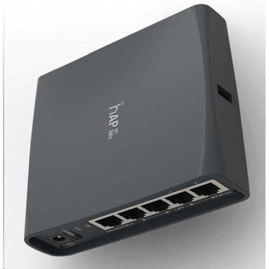 hAP ac lite je nový kompaktní router podporující standard 802.11ac. Je integrována jak 2.4GHz tak 5GHz Wi-Fi. (2.4GHz využívá 802.11b/g/b, dual chain 1.5dBi anténa, 300Mbps / 5GHz jede na 802.11ac a nechybí ani zpětná kompatibilita s 802.11a/n., single chain - 2dBi anténa, 433Mbps). Tato duální wifi tak dosahuje celkových přenosových rychlostí až 733Mbps. Procesor je taktován na 650MHz a sekunduje mu 64MB RAM operační paměti typu DDR. K dispozici je celkem pět ethernetových portů 100Mbps s podporou PoE in(port1) taktéž out (port5).