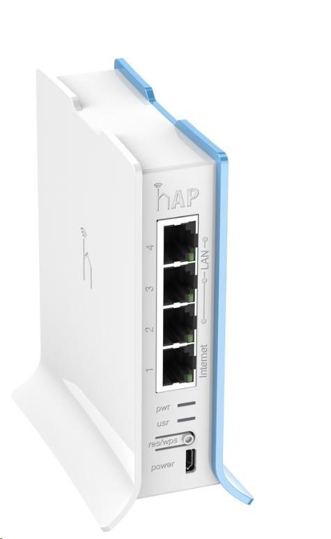hAP lite je nový router (AP) určený zejména do domácností a malých kanceláří. Nábízí 2.4GHz WiFi se standardy 802.11 b/g/n s tlačítkem WPS pro snadné připojení klientů bez znalosti hesla. Procesor je taktován na 650MHz a sekunduje mu 32MB RAM operační paměti typu DDR. K dispozici jsou celkem čtyři ethernetové porty 100Mbps s Auto-MDI/X. Napájení probíhá skrz microUSB port, který slouží čistě k tomuto účelu nikoliv pro data. Napájecí adaptér je součástí balení.