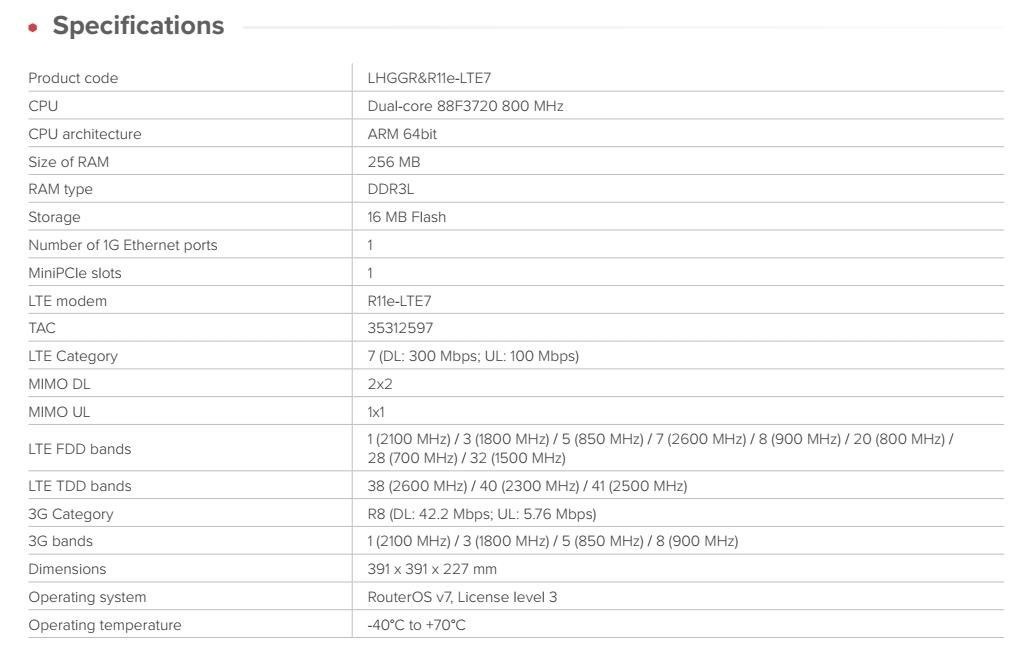 Extra výkonný venkovní aktivní prvek pro připojení k LTE na dlouhé vzdálenosti či odloučených lokalitách se slabým pokrytím signálem. LHGG LTE7 kit je navržena pro spolehlivý přístup k internetu „na poslední míli“ ve vzdálených lokalitách. Namontujte ji venku na sloup nebo stožár a připojte se i tam, kde mobilní telefony selhávají. Je vybavena směrovou anténou s vysokým ziskem 17dBi a modemem CAT7 LTE s rychlostí nahrávání až 100 Mbps, což zajišťuje vyšší výkon a lepší odezvu ve venkovských oblastech. Díky dvojnásobné kapacitě uplinku je vhodnější pro video dohled, VPN, práci na dálku a nasazení ve venkovských oblastech s více uživateli. Lehká mřížková konstrukce antény snižuje zatížení větrem a zároveň zachovává vysoký zisk. Lze ji montovat různými způsoby, včetně stožárů a sloupů. Odolný kryt a provozní teplotní rozsah od -40 °C do +70 °C zajišťují spolehlivý výkon v náročných klimatických podmínkách. Robustní chladič udržuje systém stabilní i při nepřetržitém zatížení. Hlavní funkce a vlastnosti: • VYSOKORYCHLOSTNÍ INTERNET I V ODLEHLÝCH LOKALITÁCH • RYCHLÝ MODEM CAT6 LTE • MODERNÍ DVOUJÁDROVÝ PROCESOR ARM • GIGABITOVÝ ETHERNET SE VSTUPEM POE-IN • PODPORA PÁSMA B28 • VELKÁ ANTÉNA S VYSOKÝM ZISKEM • MŘÍŽKOVÁ KONSTRUKCE ANTÉNY PRO NEJEXTRÉMNĚJŠÍ METEO PODMÍNKY RouterOS Mikrotik plně podporuje sítě IPv6 Technické specifikace: Product code: LHGGR&R11e-LTE7 CPU: Dual-core 88F3720 800 MHz CPU architecture: ARM 64bit Size of RAM 256 MB RAM type: DDR3L Storage: 16 MB Flash Number of 1G Ethernet ports: 1 MiniPCIe slots: 1 LTE modem: R11e-LTE7 TAC: 35312597 LTE Category: 7 (DL: 300 Mbps; UL: 100 Mbps) MIMO DL: 2x2 MIMO UL: 1x1 LTE FDD bands: 1 (2100 MHz) / 3 (1800 MHz) / 5 (850 MHz) / 7 (2600 MHz) / 8 (900 MHz) / 20 (800 MHz) / 28 (700 MHz) / 32 (1500 MHz) LTE TDD bands: 38 (2600 MHz) / 40 (2300 MHz) / 41 (2500 MHz) 3G Category: R8 (DL: 42.2 Mbps; UL: 5.76 Mbps) 3G bands: 1 (2100 MHz) / 3 (1800 MHz) / 5 (850 MHz) / 8 (900 MHz) Dimensions: 391 x 391 x 227 mm Operating system: RouterOS v7, License level 3 Operating temperature: -40°C to +70°C Napájení: DC input: PoE-In PoE-In input Voltage: 12-57 V Power adapter nominal voltage: 24 V Power adapter nominal current: 0.8 A PoE-in: 802.3af/at Max power consumption: 8 W.