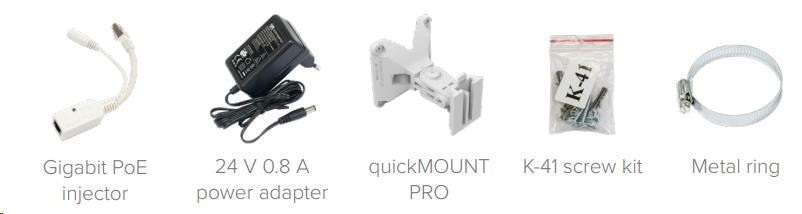Balení obsahuje: mANTBox 2 12s, Gigabit PoE injektor, napájecí zdroj, montážní sada na stožár(zeď), quickMOUNT pro