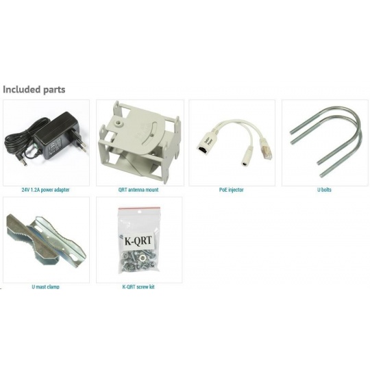 Balení obsahuje: RouterBOARD RB911G-5HPnD-QRT, PoE injektor a napájecí zdroj, montážní sada