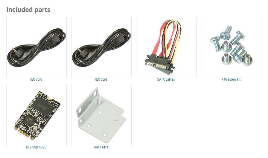 Balení obsahuje: RB1100AHx4 v hliníkovém krytu do 1U, integrovaný napájecí zdroj, 2x napájecí kabel, SATA kabel, M.2 SSD 60GB, úchyty do rozvaděče