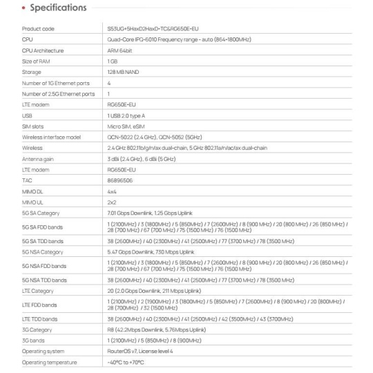 Chateau 5G R17 ax je vysokorychlostní Wi-Fi 6 domácí wifirouter s podporou 5G technologie Chateau je navržen tak, aby sloužil nejrůznějším skupinám uživatelů: od profesionálů v oblasti IT až po běžné domácnosti. Skýtá ultrarychlé prémiové připojení a je navržen tak, aby 5G technologie byla dostupnější než kdykoli předtím. Chateau je nyní vybaven špičkovým modemem 5G Release 17 a plně využívá nejnovější mobilní technologie včetně pokročilých kombinací agregace operátorů. To znamená vyšší rychlost downlinku, vyšší stabilitu signálu a rychlejší odezvu i v oblastech se slabším mobilním pokrytím. TOP bezdrátový výkon Díky čtyřem výkonným vestavěným anténám LTE/5G a dvěma externím dvouřetězcovým anténám Wi-Fi 6 poskytuje Chateau skvělý výkon pro stahování a odesílání dat i v zarušeném prostředí: • Chytrá agregace s podporou širokého regionálního pásma FDD + TDD • Mimořádně silný příjem signálu díky technologii 4x4 MIMO; • Pokrytí Wi-Fi navržené pro domácnosti všech velikostí, včetně vícepodlažních objektů Vaše síť, vaše pravidla (- eSIM nebo microSIM?) Chateau má přímo v sobě integrovanou SIM kartu (eSIM), plně kompatibilní s: • MikroTik Connectivity (předaktivované datové tarify) • eSIM třetích stran (profily eSIM mobilních operátorů) • Více profilů eSIM (snadné přidávání, přepínání nebo ukládání) RouterOS - operační systém jednotek Routerboard Chateau využívá RouterOS v7, operační systém společnosti MikroTik pro průmyslové použití, který používají poskytovatelé internetu a správci sítě po celém světě. Operační systém s jednoduchým uživatelsky přívětivým rozhraním, které se může naučit používat každý. K dispozici též uživatelská aplikace pro iOS/Android pro ještě snadnější instalaci. Bezplatný pokočilý RouterOS umožňuje uživateli celou řadu užitečných funkcí .... Nastavte si bezpečnou síť VPN. Optimalizujte streamování. Omezte šířku pásma. Vytvářejte sítě VLAN. Blokujte weby. Odesílání upozornění SMS při špičkách. Chateau 5G ax R17 je optimální volbou pro uživatele • kteří potřebují rychlý, spolehlivý a bezpečný internet LTE/5G. • mobilní operátory, kteří hledají moderní, jednoduchou a cenově dostupnou správu zařízení TR-069. • domácnosti unavené z laciných wifirouterů s limitovanou funkcionalitou a výkonem. • připravené opustit pomalé DSL nebo nejednotné extendery Wi-Fi. RouterOS kontejnery K dispozici funkce kontejnerů - pro domácí automatizaci, blokování reklam, jednoduchý webhosting, privátní DNS, síťové úložiště, IoT a mnoho dalšího. Vlastnosti Chateau je vybaven všemi pokročilými funkcemi RouterOS, takže získáte řešení podnikové úrovně za cenu spotřebitelské třídy. • využívejte zabezpečenou síť VPN z kanceláře přímo k vám domů • povolte nejrůznější druhy rodičovské kontroly • ponořte se do specifických pravidel brány firewall a hardwarové akcelerace IPsec • nakonfigurujte sítě VLAN, nastavte e-mailová nebo SMS upozornění • můžete automatizovat složitá spouštěcí oznámení (např: "VAROVÁNÍ!" pokud šířka pásma dosáhla hodnoty X po dobu trvání Y!) Technické specifikace: Product code: S53UG+5HaxD2HaxD-TC&RG650E-EU CPU: Quad-Core IPQ-6010 Frequency range - auto (864-1800MHz) CPU Architecture: ARM 64bit Size of RAM: 1 GB Storage: 128 MB NAND Number of 1G Ethernet ports: 4 Number of 2.5G Ethernet ports: 1 LTE modem: RG650E-EU USB: 1x USB 2.0 type A SIM slots: Micro SIM, eSIM Wireless interface model: QCN-5022 (2.4 GHz), QCN-5052 (5GHz) Wireless: 2.4 GHz 802.11b/g/n/ax dual-chain, 5 GHz 802.11a/n/ac/ax dual-chain Antenna gain: 3 dBi (2.4 GHz), 6 dBi (5 GHz) LTE modem: RG650E-EU TAC: 86896506 MIMO DL: 4x4 MIMO UL: 2x2 5G SA Category: 7.01 Gbps Downlink, 1.25 Gbps Uplink 5G SA FDD bands 1 (2100MHz) / 3 (1800MHz) / 5 (850MHz) / 7 (2600MHz) / 8 (900 MHz) / 20 (800 MHz) / 26 (850 MHz) / 28 (700 MHz) / 67 (700 MHz) / 75 (1500 MHz) / 76 (1500 MHz) 5G SA TDD bands 38 (2600MHz) / 40 (2300MHz) / 41 (2500MHz) / 77 (3700 MHz) / 78 (3500 MHz) 5G NSA Category 5.47 Gbps Downlink, 730 Mbps Uplink 5G NSA FDD bands 1 (2100MHz) / 3 (1800MHz) / 5 (850MHz) / 7 (2600MHz) / 8 (900 MHz) / 20 (800 MHz) / 26 (850 MHz) / 28 (700 MHz) / 67 (700 MHz) / 75 (1500 MHz) / 76 (1500 MHz) 5G NSA TDD bands 38 (2600MHz) / 40 (2300MHz) / 41 (2500MHz) / 77 (3700 MHz) / 78 (3500 MHz) LTE Category 20 (2.0 Gbps Downlink, 211 Mbps Uplink) LTE FDD bands 1 (2100MHz) / 2 (1900MHz) / 3 (1800MHz) / 5 (850MHz) / 7 (2600MHz) / 8 (900 MHz) / 20 (800MHz) / 28 (700MHz) / 32 (1500 MHz) LTE TDD bands 38 (2600MHz) / 40 (2300MHz) / 41 (2500MHz) / 42 (3500MHz) / 43 (3700MHz) 3G Category R8 (42.2Mbps Downlink, 5.76Mbps Uplink) 3G bands 1 (2100MHz) / 5 (850MHz) / 8 (900MHz) Operating system: RouterOS v7, License level 4 Operating temperature: -40°C to +70°C Napájení: Number of DC inputs: 1 DC jack input Voltage: 12-28 V Power adapter nominal voltage: 24 V Power adapter nominal current: 1.2 A Max power consumption (without attachments): 16 W Max power consumption: 26 W Upozornění Výrobce Mikrotik neposkytuje záruku na zařízení poškozená přepětím. Zařízení je třeba adekvátně chránit proti indukovanému elektrostatickému přepětí či přepěťovým špičkám na silovém vedení. Pro venkovní instalace používat výhradně stíněnou kabeláž (FTP/SFTP), jednotky korektně uzemnit (užití integrovaného zemnícího členu, ethernetové přepěťové ochrany). Zařízení vždy provozujte s poslední výrobcem publikovanou verzí (výrobcem označenou "Stable") operačního systému RouterOS. Taková verze garantuje nejoptimálnější funčknost, obsahuje opravené chyby z verzí předchozích a výkonová vylepšení. .