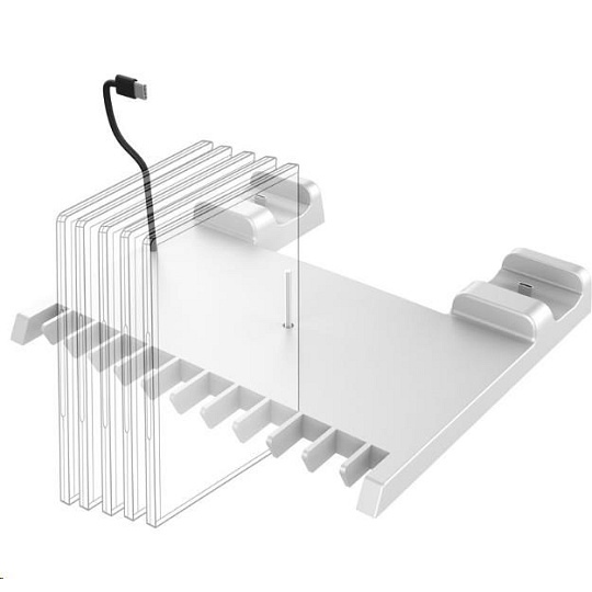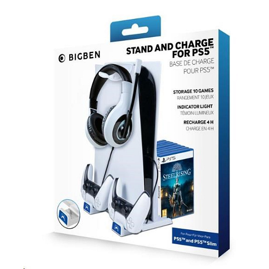 Umístěte svou herní konzoli PlayStation 5 nebo PlayStation 5 Slim do vertikální polohy s pomocí tohoto multifunkčního stojanu od společnosti Bigben Interactive. Součástí stojanu je dlouhý upevňovací šroub, který konzoli bezpečně zajistí ve vzpřímené poloze a zaručí, že se konzole nepřevrátí. Stojan dále nabízí dvě pozice pro nabíjení ovladačů DualSense a odkládací prostor až pro deset krabiček s vašimi oblíbenými hrami. Součástí balení je pak také držák na sluchátka, který můžete zavěsit přímo na konzoli.