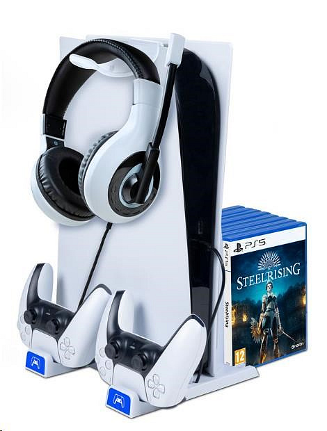 Umístěte svou herní konzoli PlayStation 5 nebo PlayStation 5 Slim do vertikální polohy s pomocí tohoto multifunkčního stojanu od společnosti Bigben Interactive. Součástí stojanu je dlouhý upevňovací šroub, který konzoli bezpečně zajistí ve vzpřímené poloze a zaručí, že se konzole nepřevrátí. Stojan dále nabízí dvě pozice pro nabíjení ovladačů DualSense a odkládací prostor až pro deset krabiček s vašimi oblíbenými hrami. Součástí balení je pak také držák na sluchátka, který můžete zavěsit přímo na konzoli.